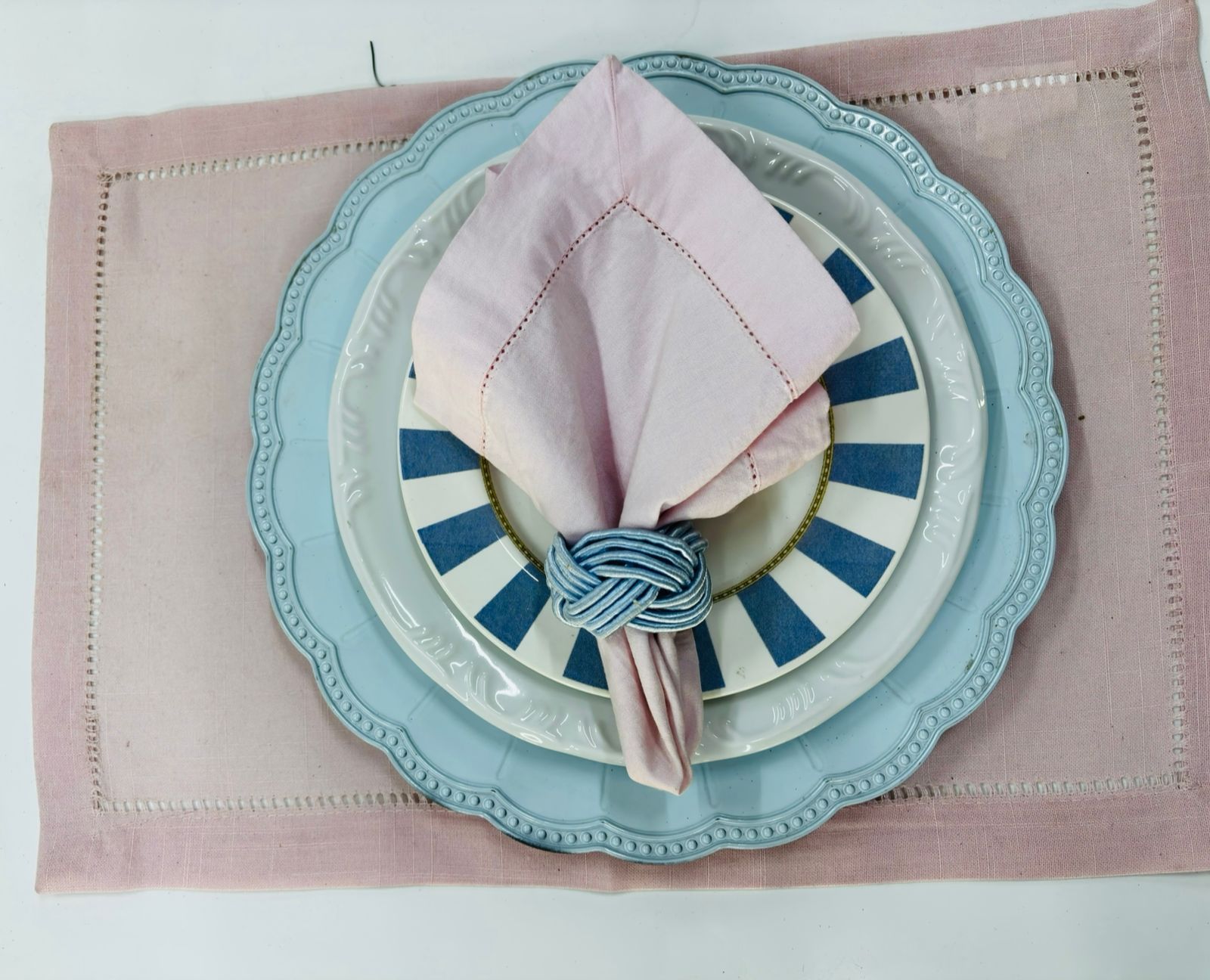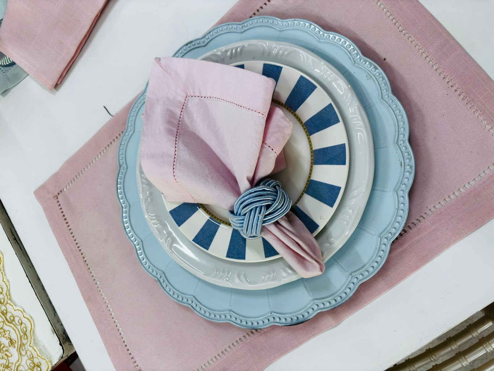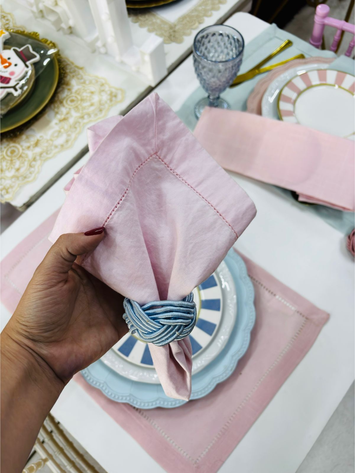 Locação de Guardanapo Cor: Rosa Bebê Tecido: Algodão com borda Ajour Tamanho: 40×40 cm