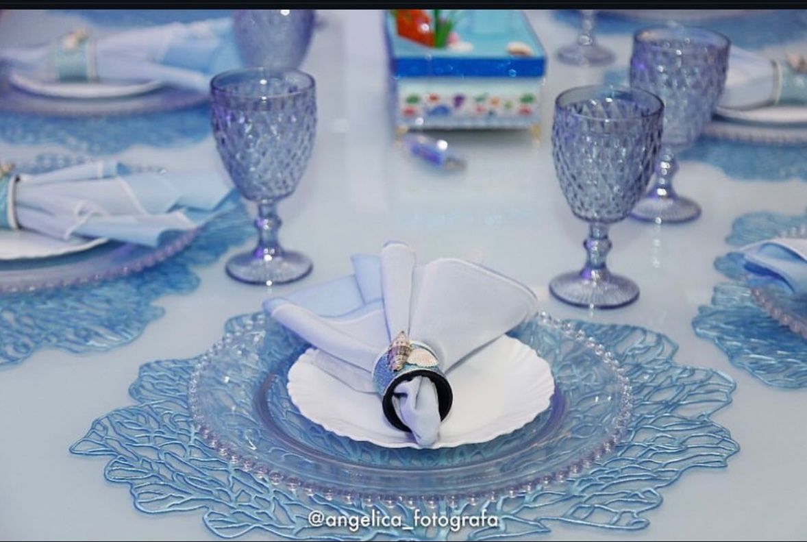 Locação de Jogo Americano Cor: Dupla face – Azul Bebê Cintilante e Azul Royal Fosco Tamanho: 48 cm
