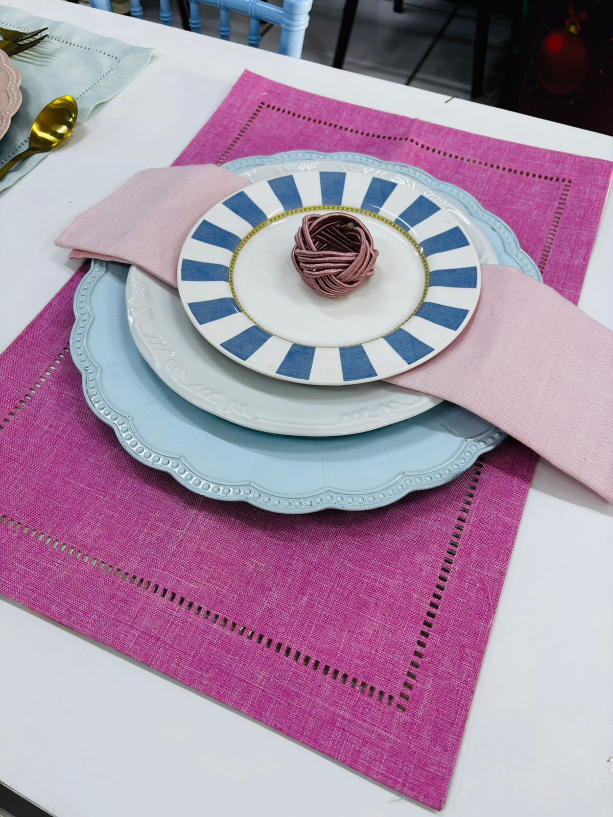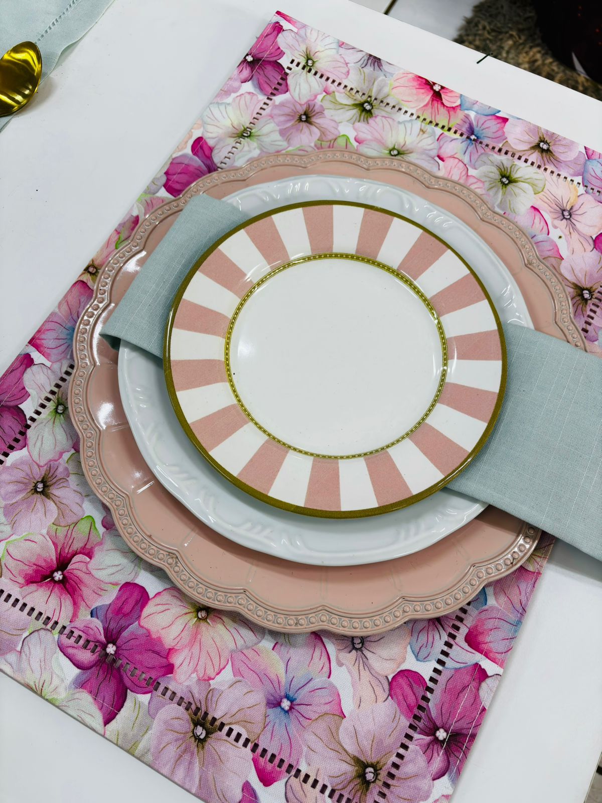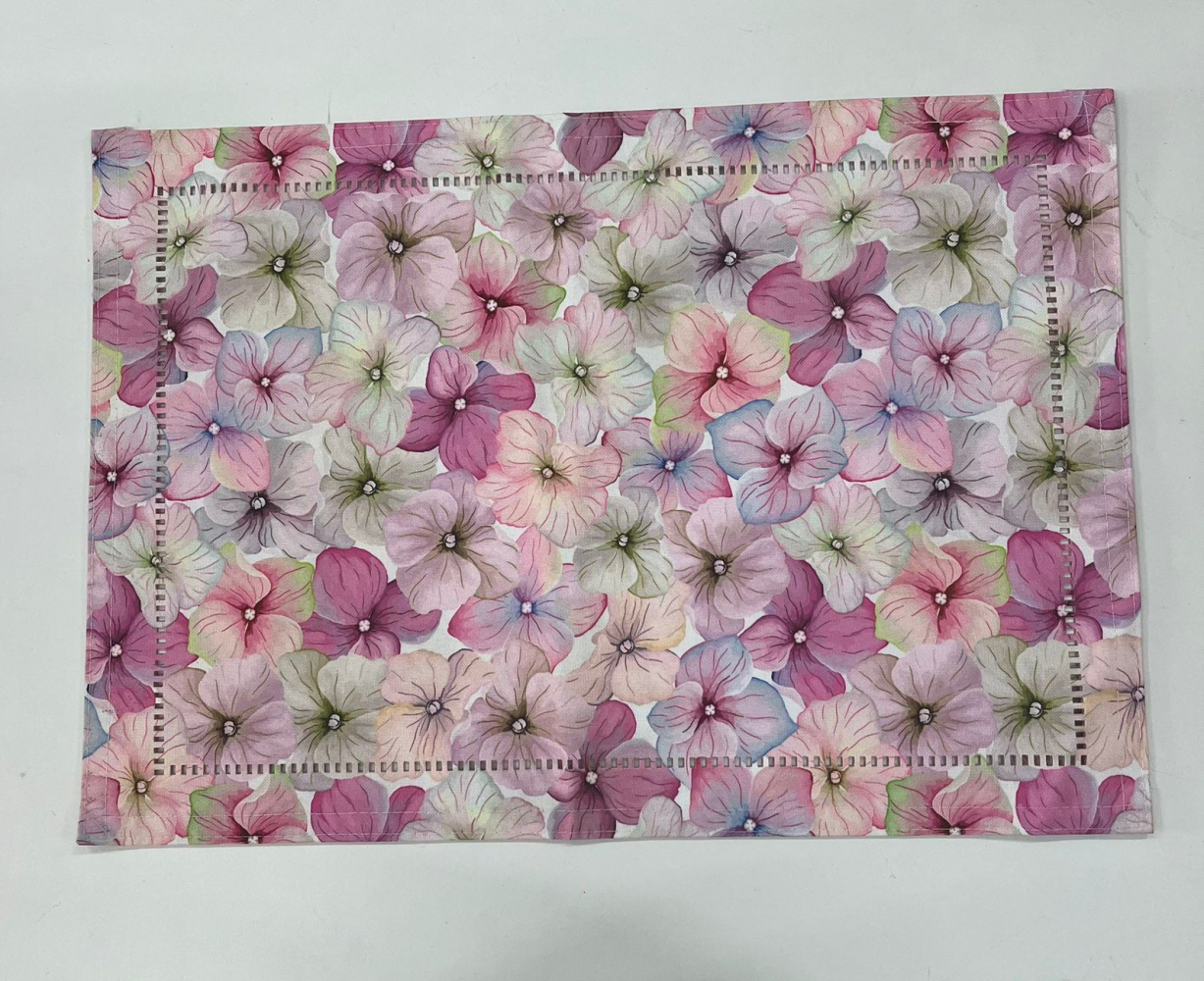 Locação de Jogo Americano Cor: Dupla Face – 1 lado floral, 1 lado rosa pink Tamanho: 35×50 cm Tecido: Impermeável