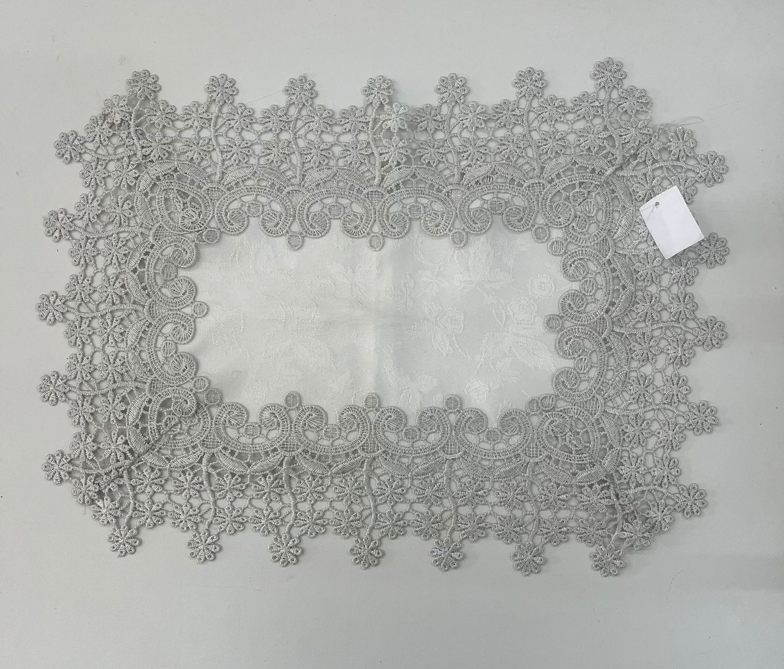 Locação de Jogo Americano Cor: Prata Tamanho: 44×32 Tecido: Poliester com Renda Guipir