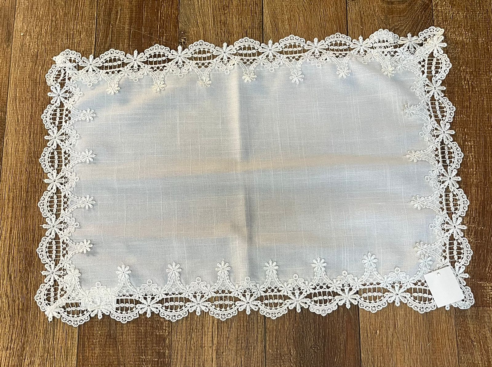 Locação de Jogo Americano Cor: Branco com Renda Guipir na barra Tamanho: 50×35 cm Tecido: Algodão