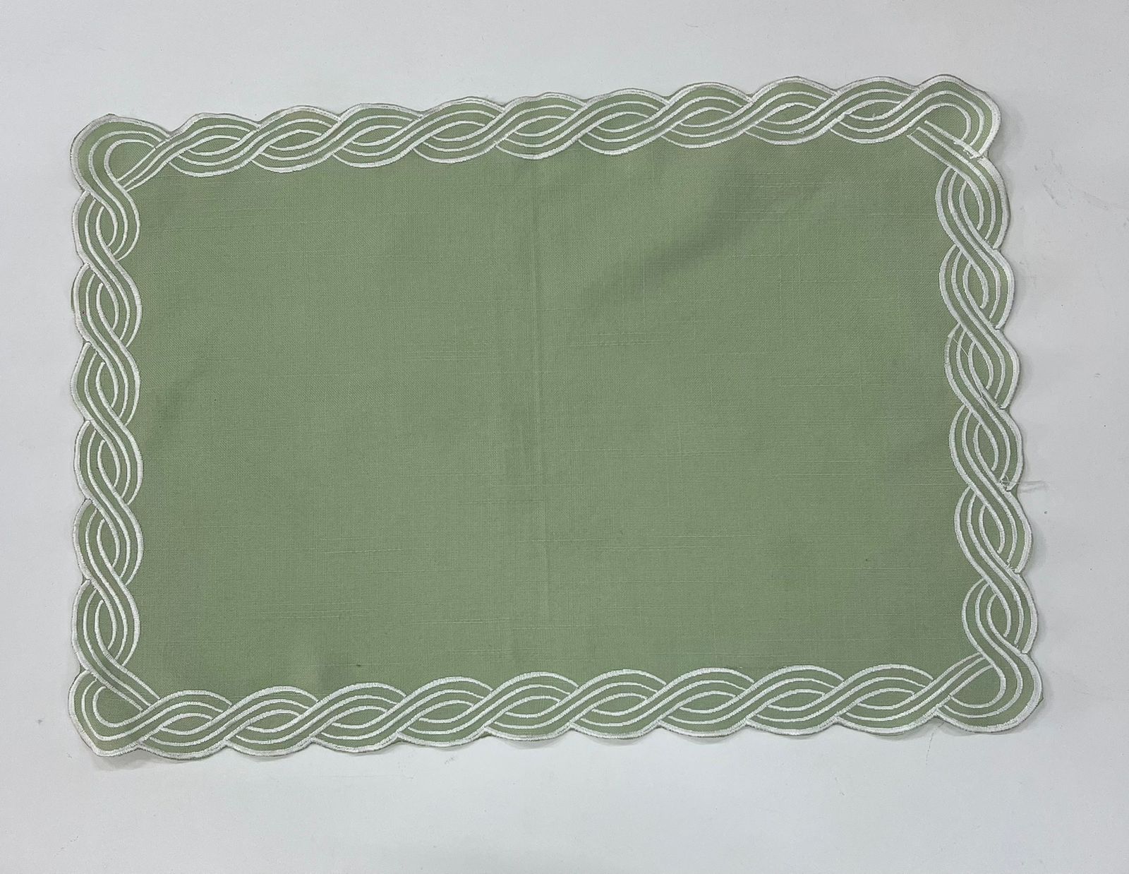 Locação de Jogo Americano Cor: Verde Bebê com bordado branco Tamanho: 50×35 cm Tecido: Linho