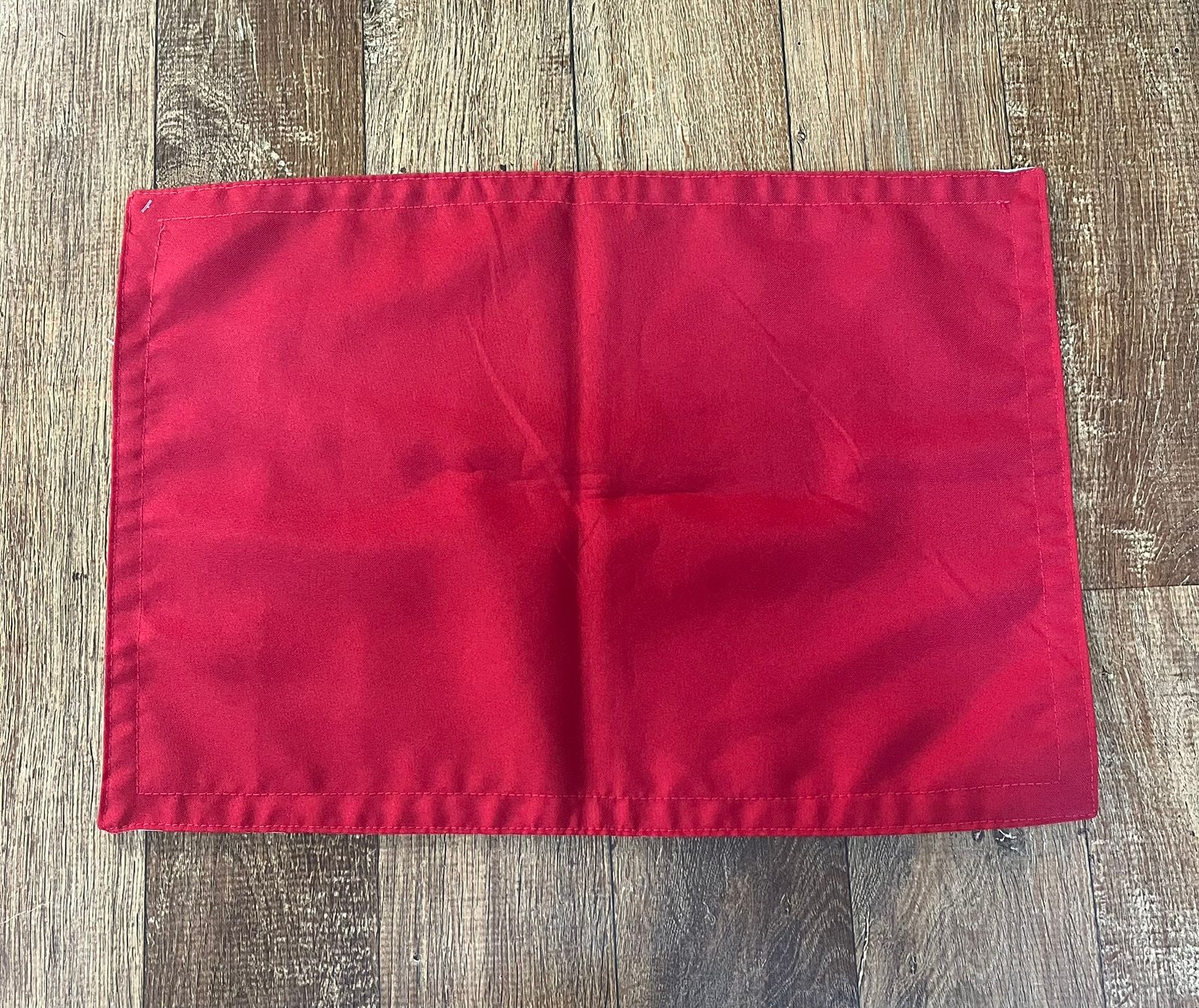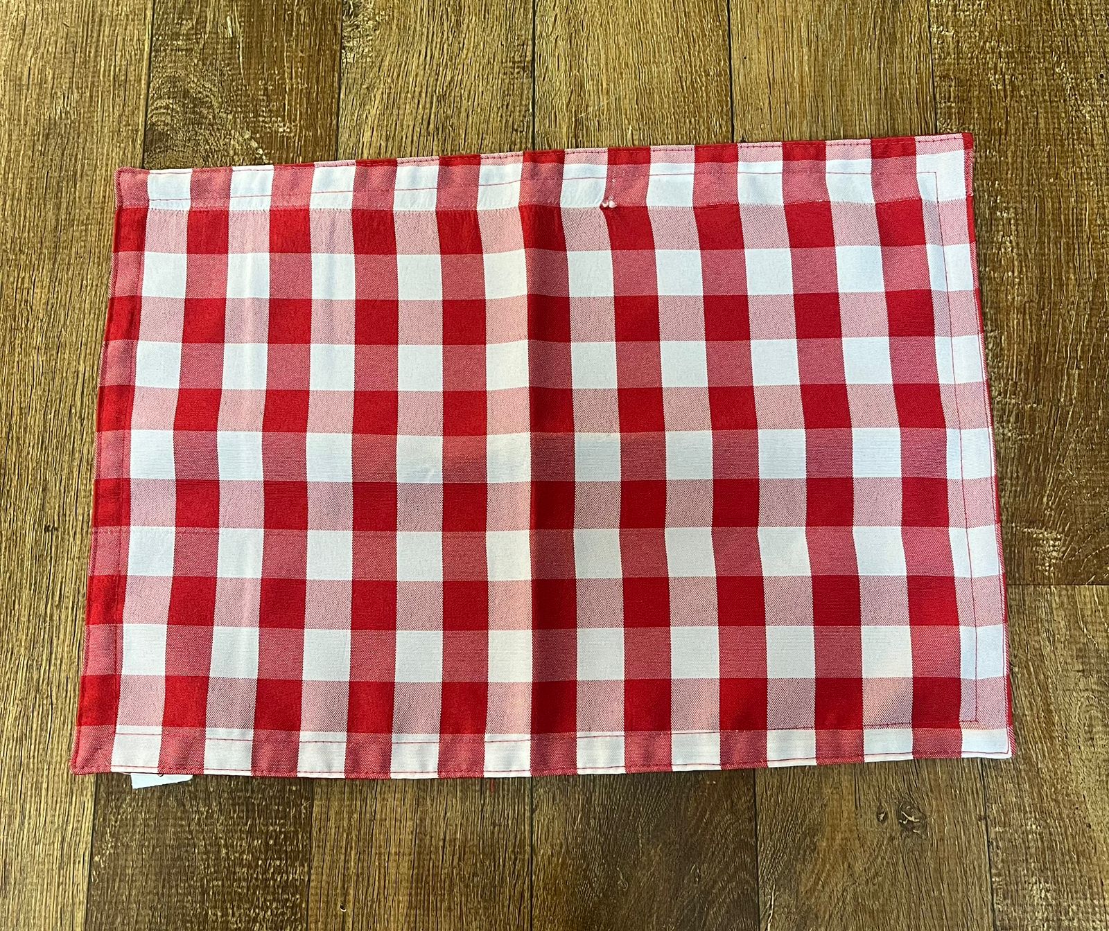 Locação de Jogo Americano Cor: Dupla Face – 1 Lado Xadrez Vermelho, outro lado vermelho liso Tamanho: 45×35 Tecido: Algodão