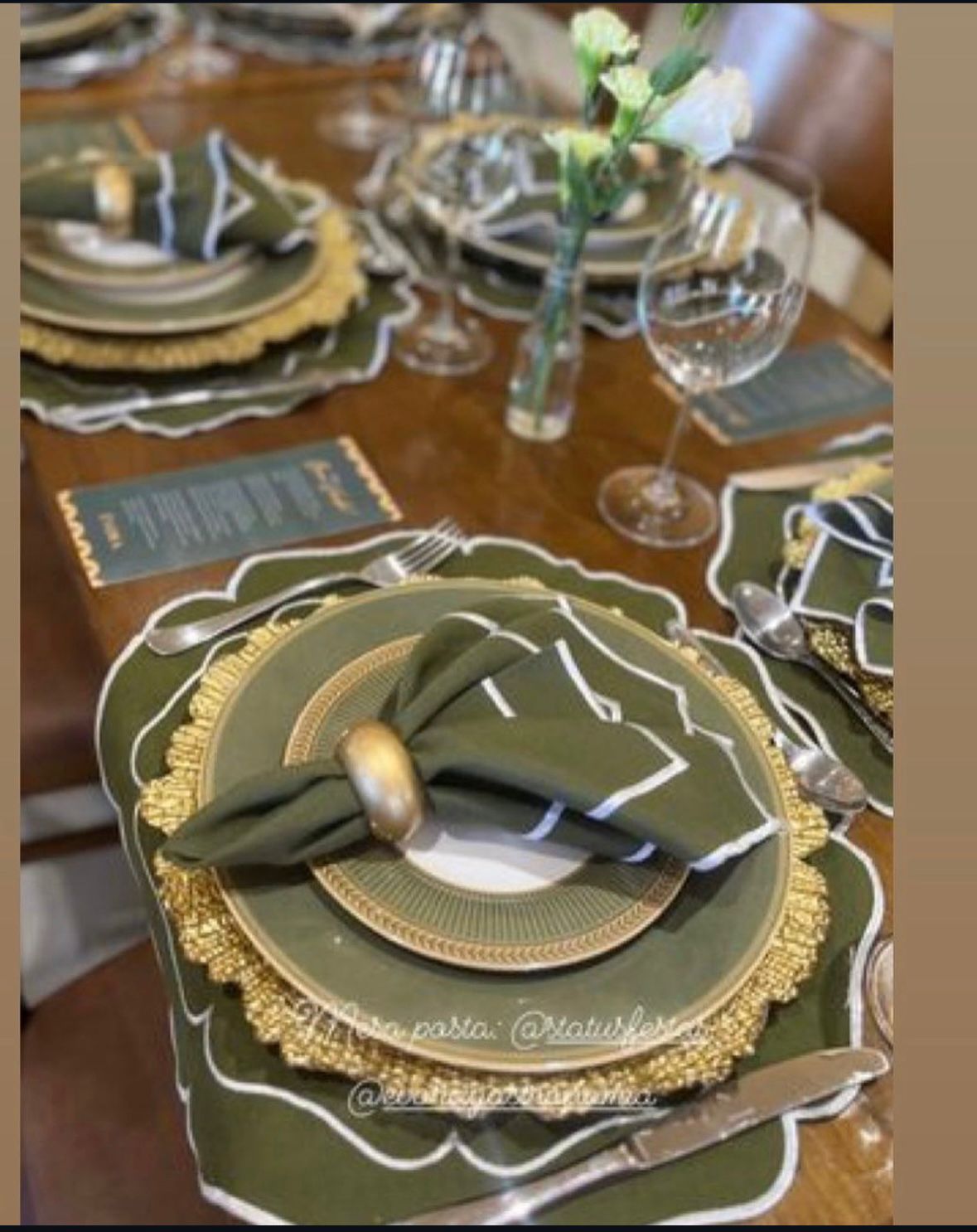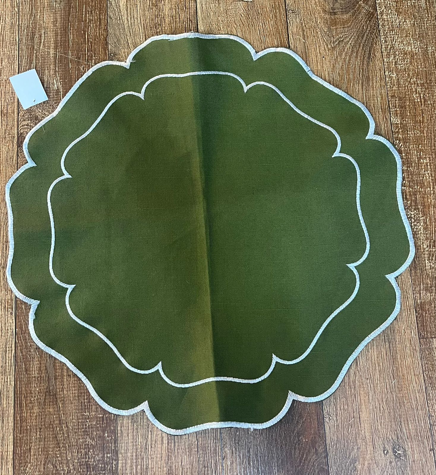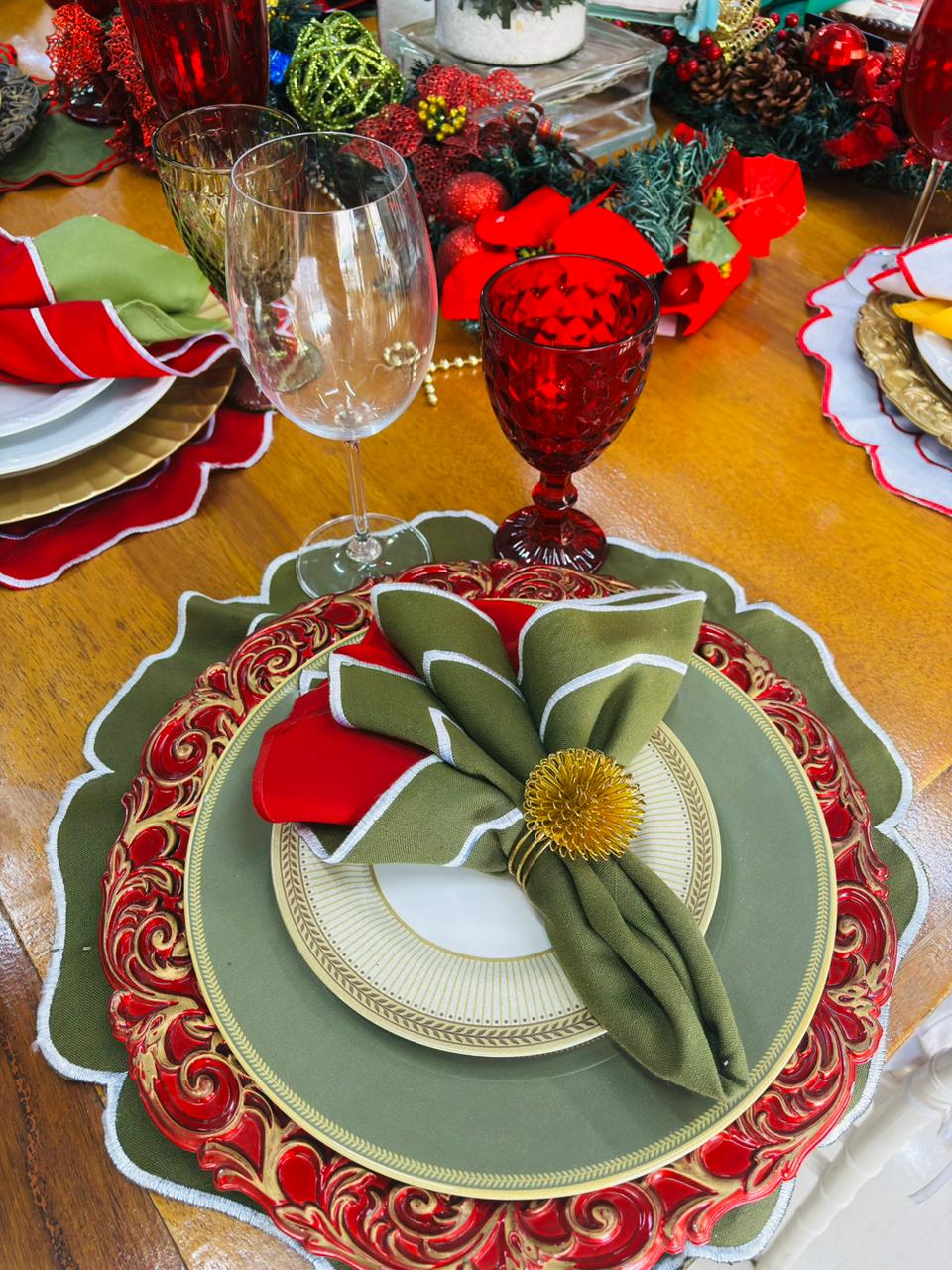 Locação de Jogo Americano Cor: Verde Musgo com bordado branco Tamanho: 45×45 cm Tecido: Linho