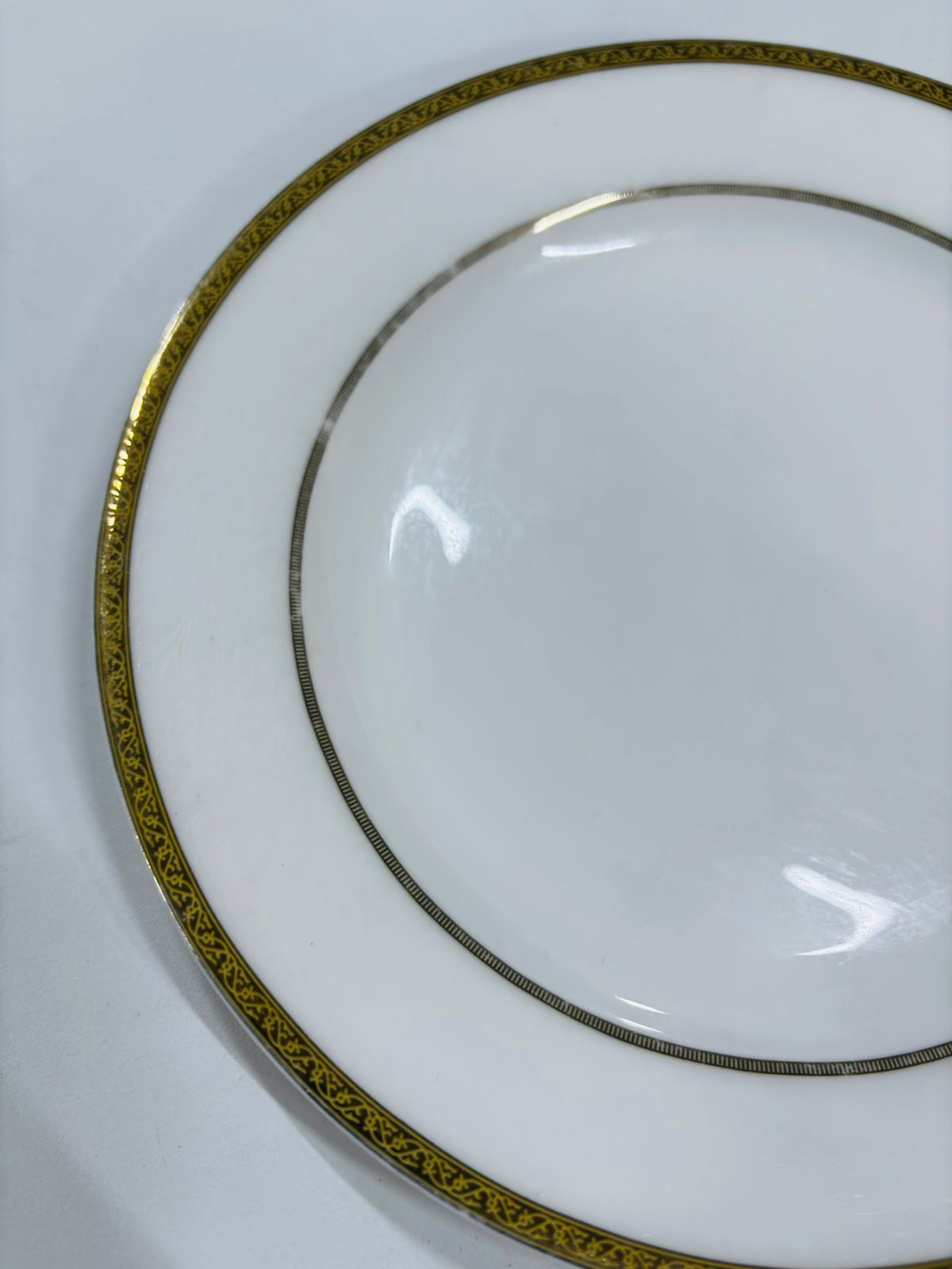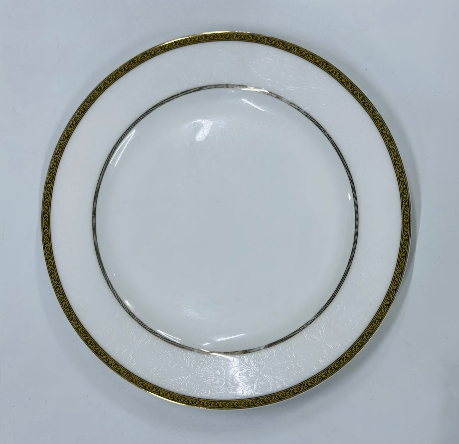 Locação de Prato de Sobremesa Filetado Material: Porcelana filetado a ouro Tamanho: 20 cm Cor: Branco com Filete dourado